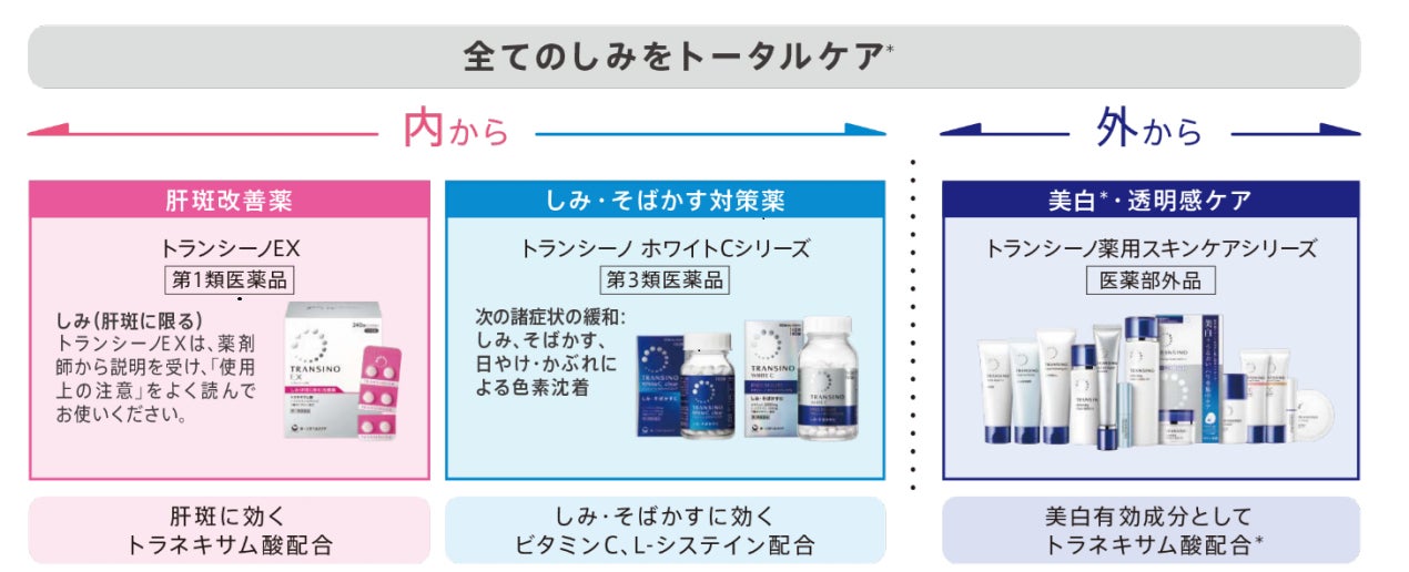 「トランシーノ」は、しみの一種である「肝斑」の効能・効果が認められた日本初*1のOTC医薬品として、2007年に誕生しました。2024年春、有効成分「ニコチン酸アミド」を追加配合した、初代発売以来初の処方強化品*2「トランシーノEX」を新発売します。