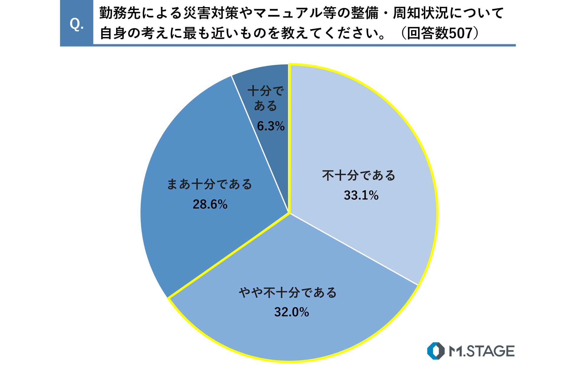 勤務先の災害対策やマニュアル等の整備・周知状況について、「不十分である」と回答する医師は33.1%、「やや不十分である」と回答する医師は32.0%となり、6割を超える医師が「不十分」と感じている結果となりました。