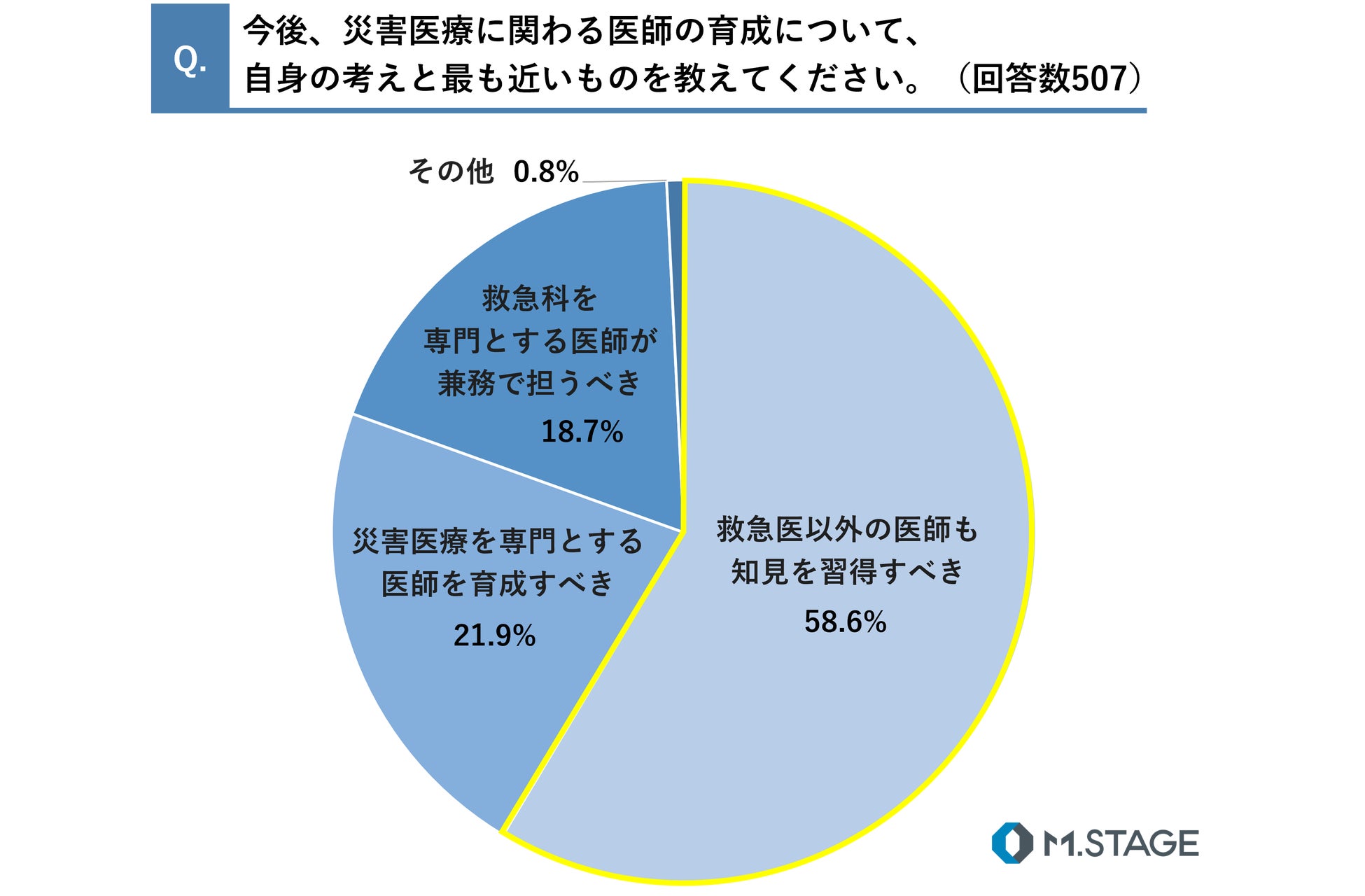 今後の災害医療に関わる医師の育成について、「救急医以外の医師も知見を習得すべき」(58.6%)という回答が最も多く、次いで「災害医療を専門とする医師を育成すべき」(21.9%)「救急科を専門とする医師が兼務で担うべき」(18.7%)が続く結果となりました。