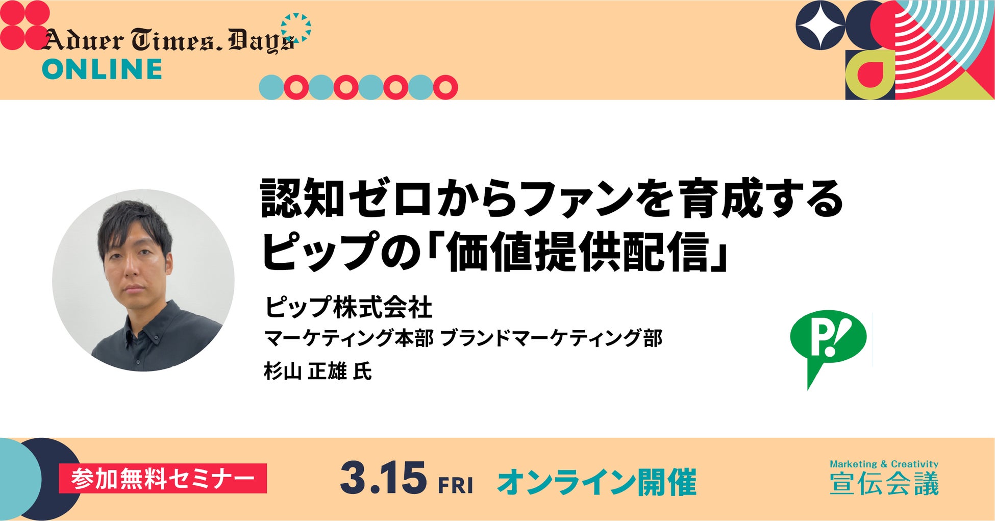 ピップ株式会社(本社:大阪市中央区、代表取締役社長:松浦由治)は、2024年3月11日(月)〜 3月15日(金)に開催される「アドタイ・デイズ2024(春) オンライン(主催:株式会社宣伝会議)に当社の杉山正雄が登壇し、SNS運用メソッド「価値提供配信」について講演を行うことをお知らせいたします。
