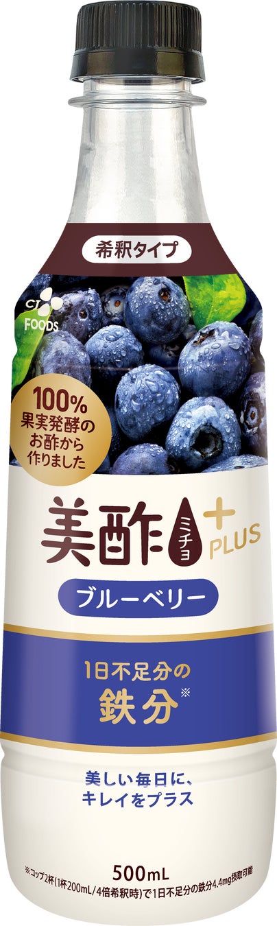 持ち運びやトライアルいただきやすい500mL希釈式の『美酢プラス』が、嬉しい栄養成分が入ったラインナップにリニューアルいたします。第一弾として新フレーバーのブルーベリーは、1日不足分の鉄分*を配合。美しい毎日を過ごすためのビネガードリンクです。100%果実発酵酢を使用し、ジューシーなブルーベリーの甘みとお酢の酸味がバランスよく、毎日飲んでも飽きない味。定番の炭酸割に加え、牛乳やヨーグルトとも相性が良く、アレンジもお楽しみいただけます。