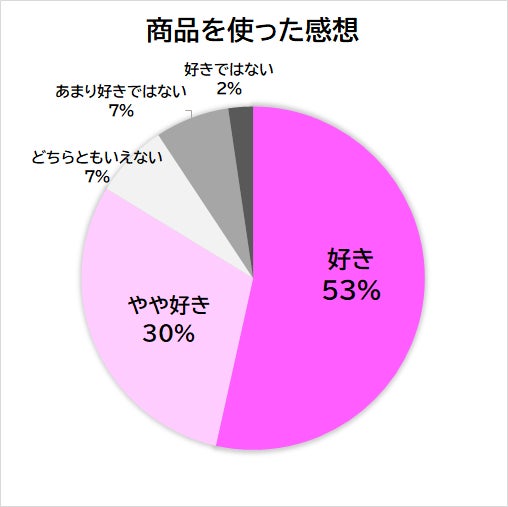 商品の使用後、「好き」(53%)と回答した割合は半数を超える結果となりました。「やや好き」(30%)を合わせた“好き”の割合は83%なり、多くの方に高評価をいただきました。