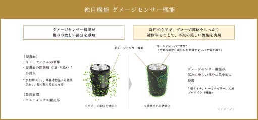 ダメージを受けた毛髪はキューティクルの剥離や髪表面の脂肪酸(18-MEA)(※4)の消失、髪深層部のコルテックスの露出などがおこります。このようなダメージ毛は親水性となり、オイルなどの親油性成分が吸着しにくくなるため、傷んだ部分を見つけ出し吸着することが出来るダメージセンサー機能により、髪を均一な状態へと補修します。