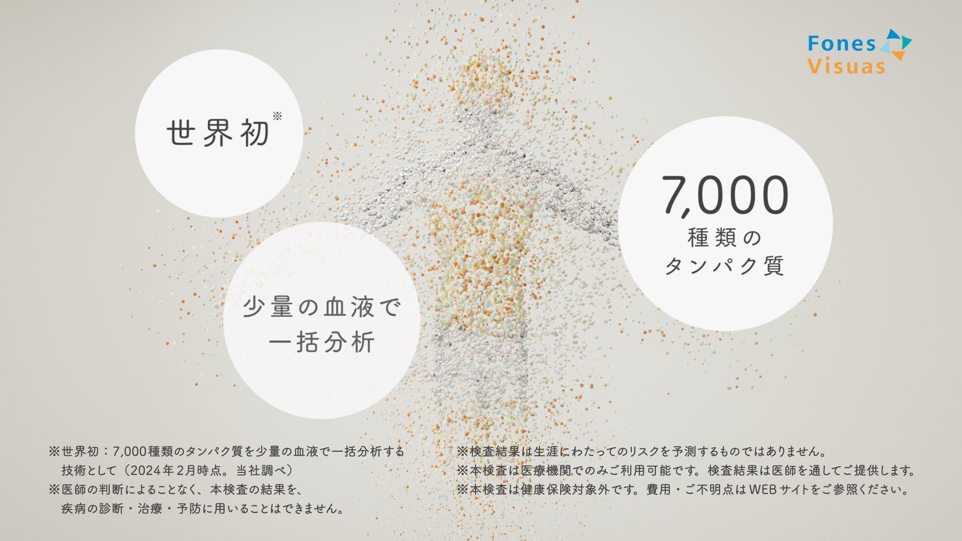 フォーネスビジュアス検査は、少量の血液(※1)から約7,000種類のタンパク質を測定する世界初(※2)の技術を活用し、「将来の疾病リスク」と「現在の体の状態」を可視化するサービス(※4)です。