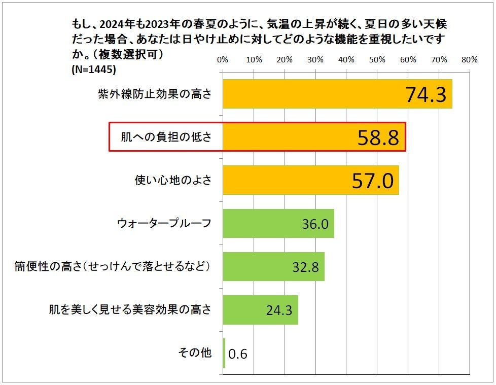 2024年が2023年夏と同じ過酷な環境だと仮定し、「日やけ止めに重視する機能」をたずねたところ、「紫外線防止効果」に次いで2位にランクインしたのは「肌への負担の低さ」でした。