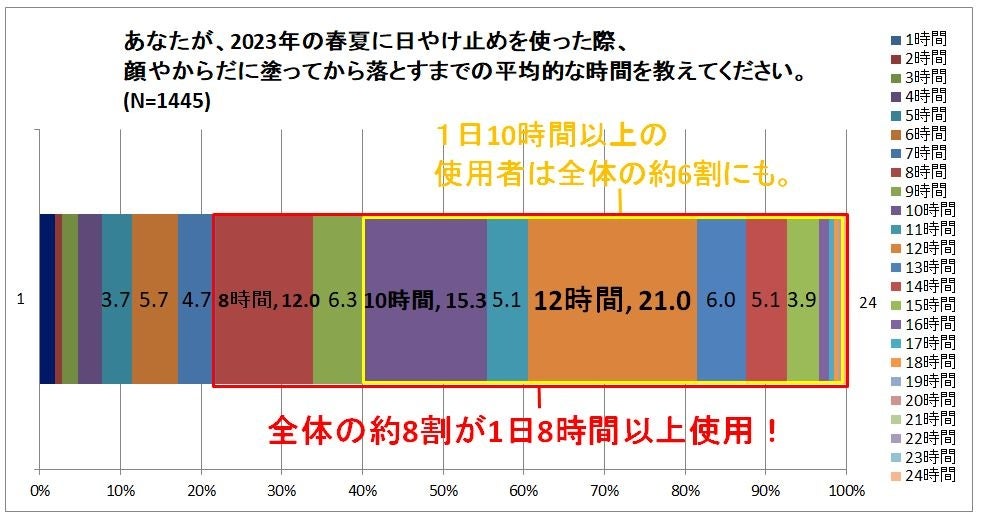☑2023年の春夏、約8割が1日「8時間」以上日やけ止めを使用。約6割が「10時間」以上使用していた。