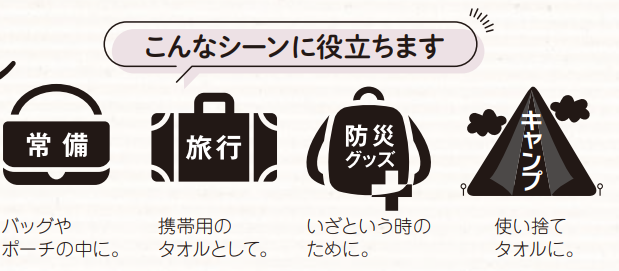 普通のタオルだとどうしてもスペースを取ってしまうので、防災グッズとして備えておくにはかさばらない。