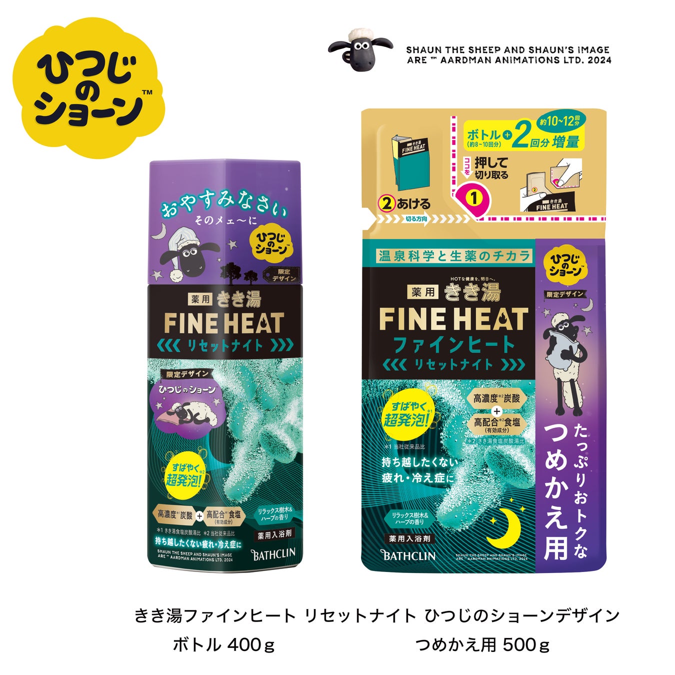 「きき湯ファインヒート リセットナイト」は、温泉科学と生薬で、おやすみ前の温浴習慣をサポートする入浴剤として、お客様にご好評いただいております。このたび、世界170か国で愛されるアニメーション「ひつじのショーン」とデザインコラボレーションした「きき湯ファインヒート リセットナイト ひつじのショーンデザイン」を3月25日(月曜日)に数量限定発売いたします。高濃度*1炭酸ガス、高配合*1食塩(温泉ミネラル)、ジンジャー末により、温浴効果を高めて体の芯まで温め、持ち越したくない疲れ・冷え症を和らげます。ナイトキャップをかぶったおやすみ前のショーンと、くつろぎのバスタイムをお過ごしください。