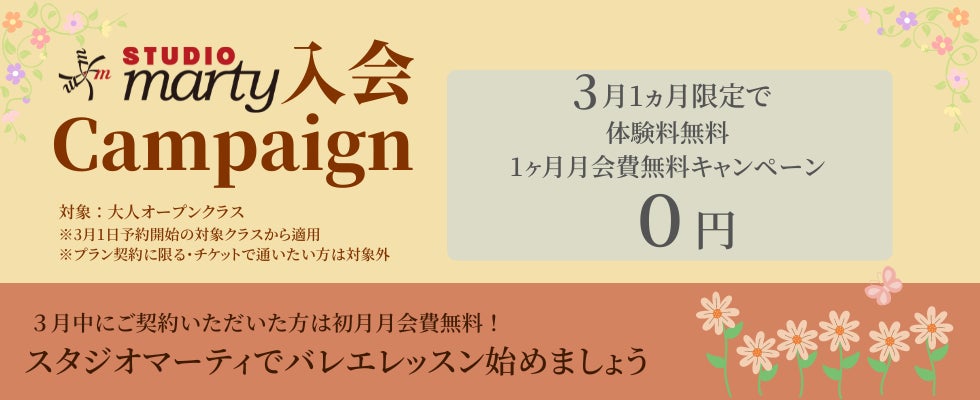 ★ただいま、新規入会キャンペーン実施中!スタジオマーティでお得に楽しくバレエを始めませんか?皆様のお越しをお待ちしております。