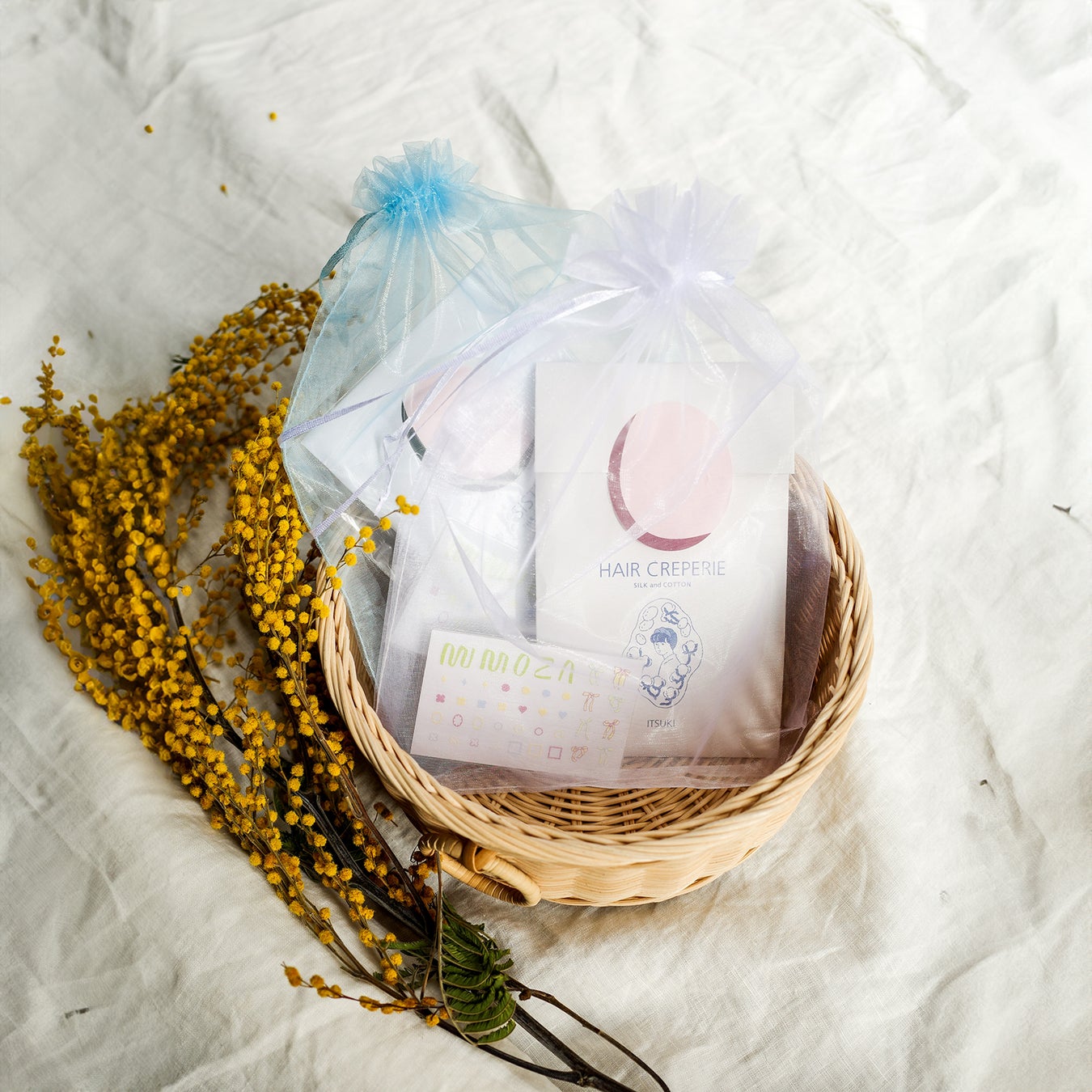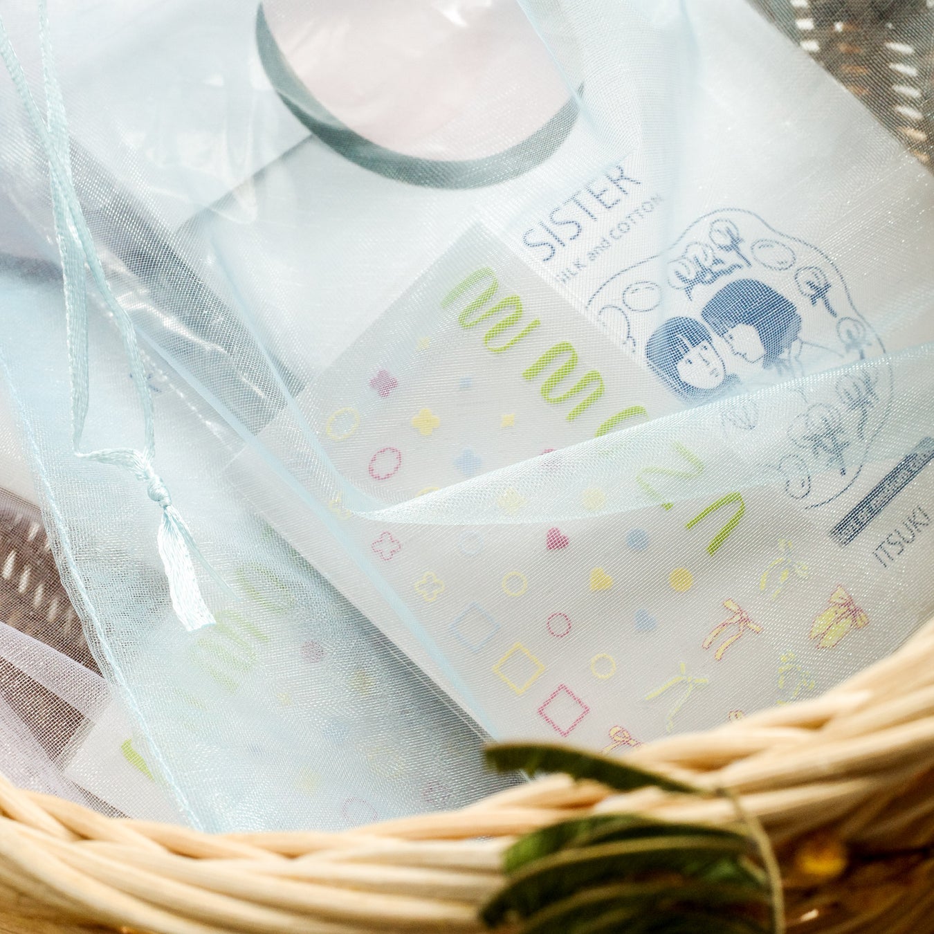 合わせてご注文いただいたアイテムとネイルシールをシフォンの巾着に入れてラッピング済みの形でお送りします。