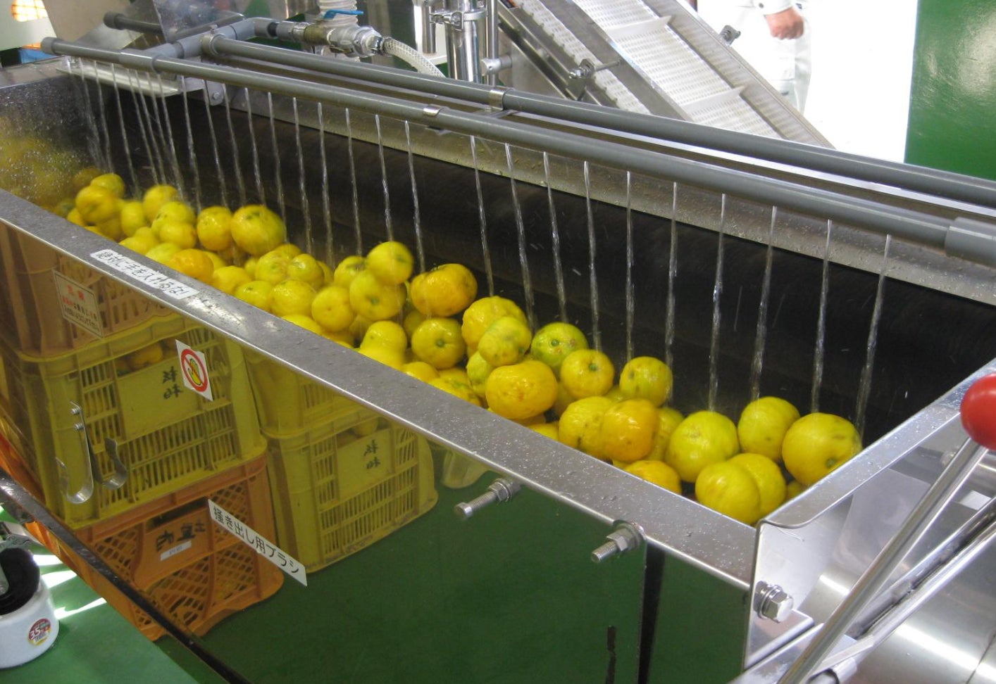 工房に入荷したゆず玉は、機械にたよらず人の手によって傷、破損、病気等を取り除く検査、選別。一定の時間、連続洗浄を行います。
