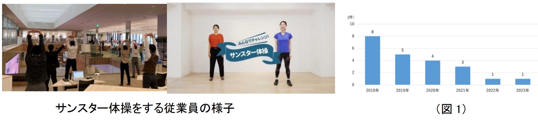 労災、主に転倒事故防止のため、2021年9月には、株式会社ルネサンスにご協力いただき、足腰の強化に重点をおいた「サンスター体操」を開発しました。年齢も体力も違う全ての方々が「安全に」「楽しく」「効果的」に体操を行うことができなければならないと考え、自分で体操レベルを選択できるように通常レベルの「スポーツスタイル」と、やさしいレベルの「オフィススタイル」 2種類の負荷レベルを用意しています。毎朝決まった時間に事業所内だけでなく、オンラインでも動画を流すことで、テレワーク勤務者も自宅で実施できるようになっています。サンスター体操導入後は、転倒災害は減少傾向にあり、2023年では1件となりました(図1)。