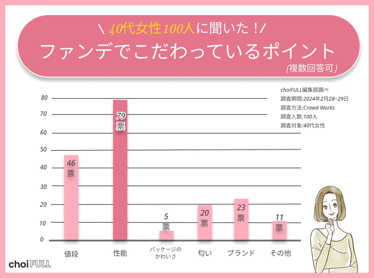 40代女性100人にファンデでこだわっていることを聞いたところ、約8割が「性能」と回答しました。そのように回答したのには、以下のような理由があります。