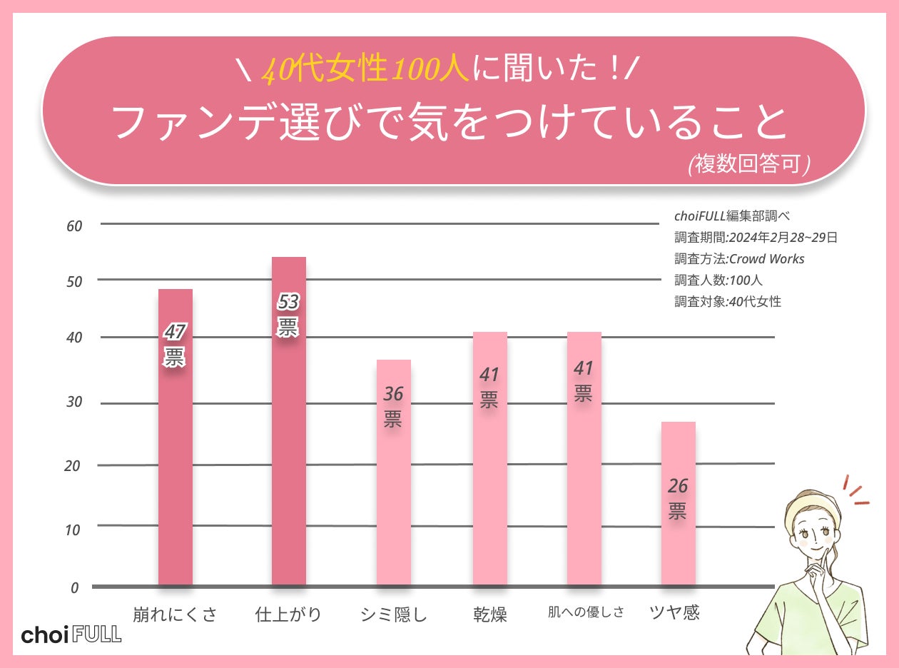 40代女性100人にファンデ選びで気をつけていることを聞いたところ、半数以上が「仕上がり」と回答。さらに、約半数が「崩れにくさ」と回答しました。