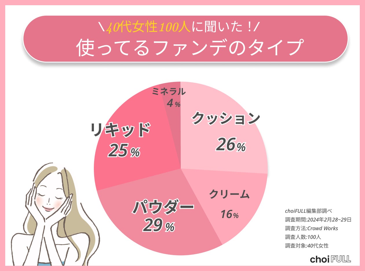 40代女性に使用中のファンデのタイプを聞いたところ、29%がパウダー、26%がクッション、25%がリキッドを使っていました。そのように回答したのには、以下の理由があります。