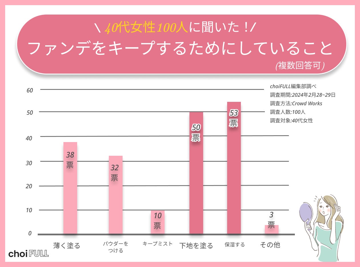 40代女性100人にファンデをキープするためにしていることを聞いたところ、半数以上が「保湿」と回答。さらに、半数が「下地を塗る」と回答しました。