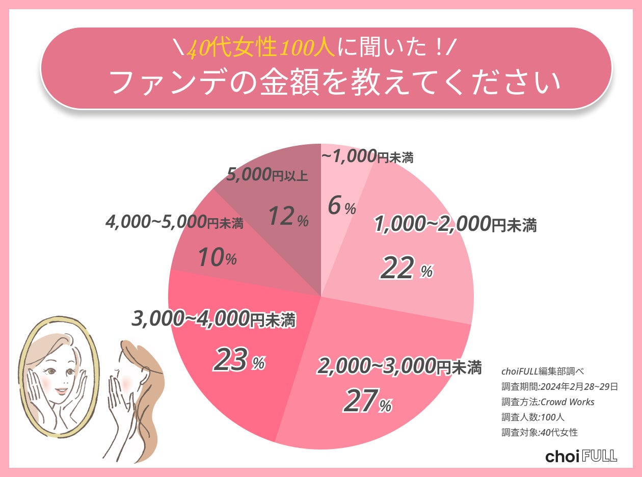 40代女性に使っているファンデの金額を聞いたところ、約3割が「2,000〜3,000円未満」と回答しました。