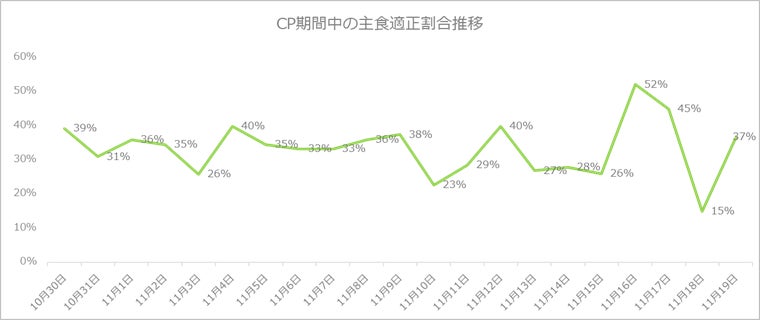 参加者の主食の適正の割合の推移は、スタート時の39%から、最大52%まで上昇しました。