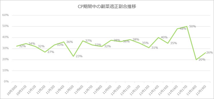 参加者の副菜の適正の割合の推移は、スタート時の32%から最大で50%まで上昇しました。