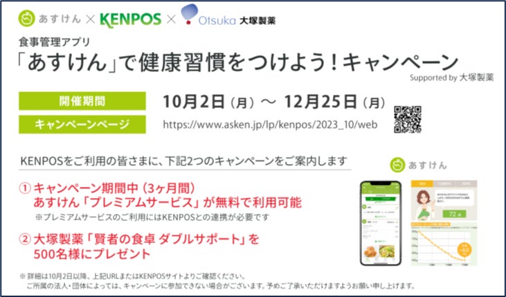 累計会員数900万人*¹、国内No.1*²のAI食事管理アプリ『あすけん』の開発・運営を行う株式会社asken(東京都新宿区、代表取締役社長 中島洋、以下「当社」)は、2023年10月2日から2023年12月25日にかけ、株式会社イーウェル(本社:東京都、代表取締役社長 社長執行役員:稲葉 章司)が運営する健康増進セルフケアサービス「KENPOS」と共同で、大塚製薬の協賛のもと生活習慣病予防に取り組む企業に向けた「健康習慣をつけよう!キャンペーン supported by大塚製薬」を実施し、参加した133団体の従業員386人に対するアンケート結果、及び、キャンペーン期間中の食事アドバイス結果の変化をとりまとめました。
