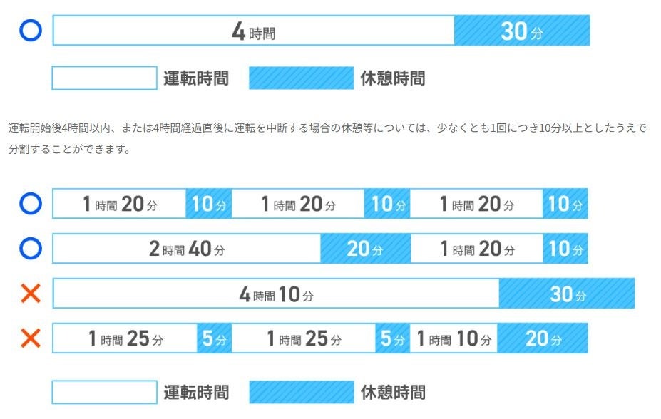 連続して運転できる時間は4時間以内とされ、運転を中断した際は原則として1回おおむね10分以上、合計30分以上の休憩時間を設ける必要があります。改正前は非運転時間を確保することとされていた為、運転の中断時に荷積みや荷下ろし作業を行うことも認められていましたが、改正後は原則として、運転を中断していても作業を行うことは認められません。