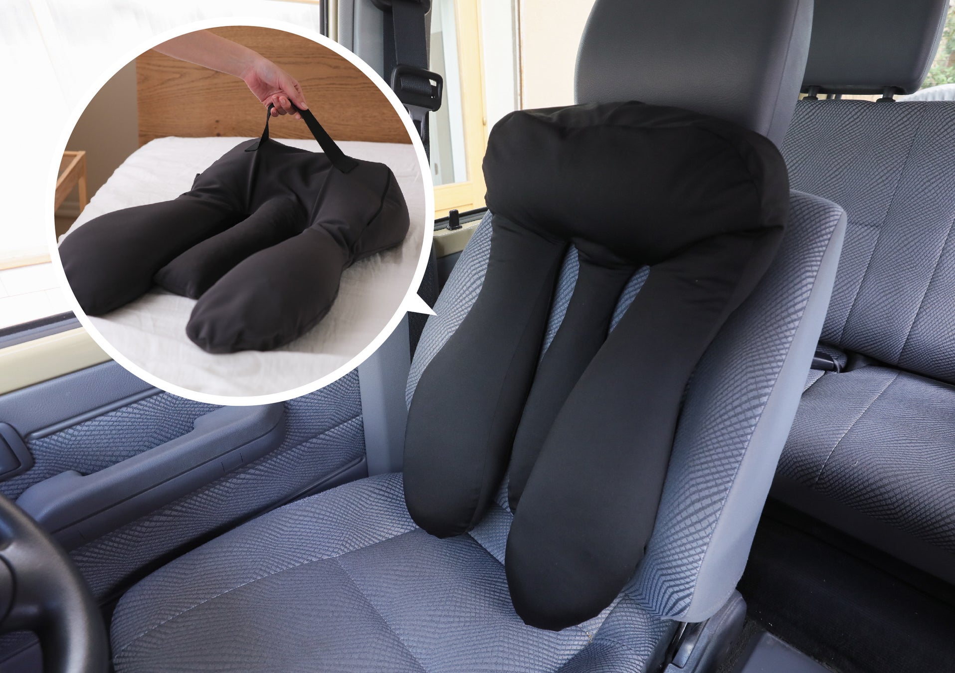 「胸を開くまくら」開発の始まりは、アウトドア好きな開発者の実体験からでした。車中泊の悩みとして、シートの形がいびつなことから寝づらい事、体が痛くて熟睡できない事など多々ありました。