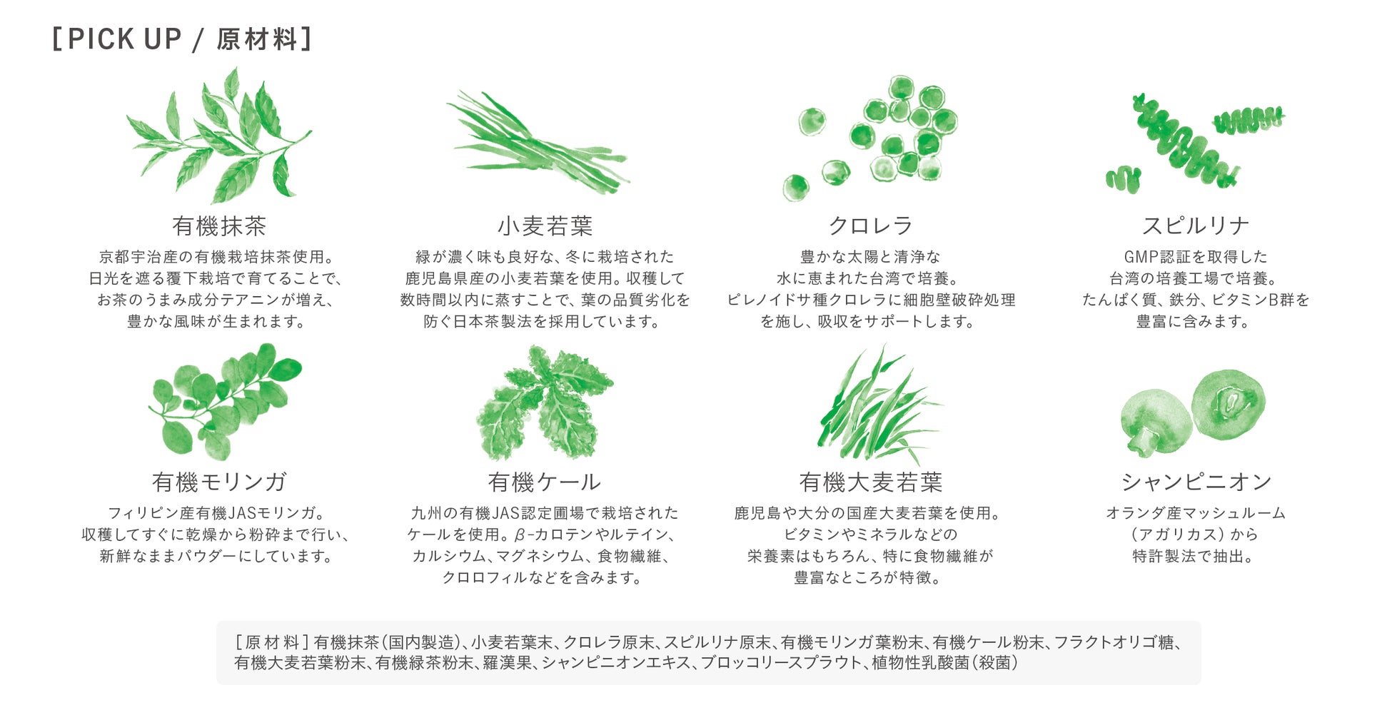 9種類のグリーンをベースに、乳酸菌やシャンピニオンエキス、プレバイオティクスとしても知られているフラクトオリゴ糖をブレンド。羅漢果でほのかな甘みをプラスしています。葉緑素、食物繊維、ビタミンB群やβカロテン、鉄や亜鉛などのミネラル類をバランスよく含んでいます。すこやかな胃腸を目指し、体全体のバランスをサポート。程よい甘さで飲みやすく、続けやすいブレンドです。