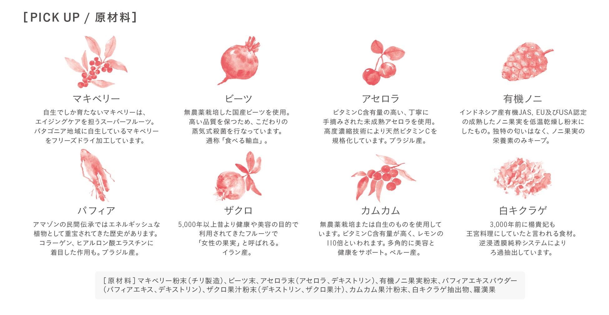 6種類の赤い果実や野菜をベースに、パフィアや白キクラゲをブレンド。アントシアニンやベタレインなどのポリフェノール、鉄分やマグネシウム、カリウム、カルシウムなどのミネラル、ビタミンCや葉酸、ビタミンB群などのビタミン、βカロテンをバランスよく含みます。美容には欠かせない栄養素と共に、日々の生活をいきいきと過ごすサポートをします。程よい酸味の爽やかな味わいです。