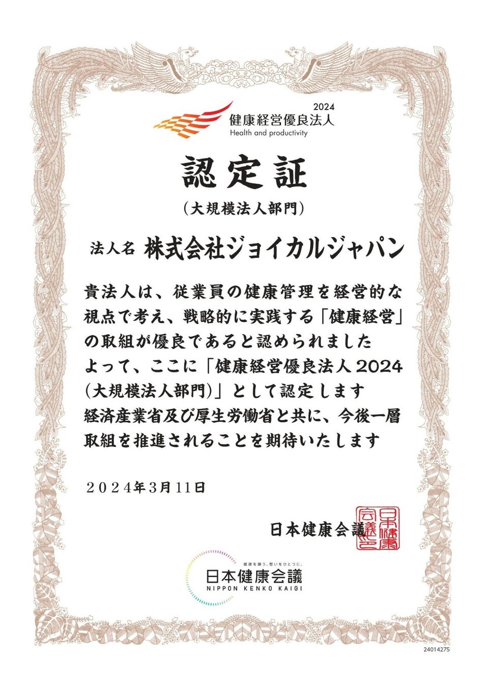 今回、その実現を目指すため、「ジョイカル三現主義」に基づく健康経営の取り組みが評価され「健康経営優良法人2024(大規模法人部門)」の認定取得を実現しました。
