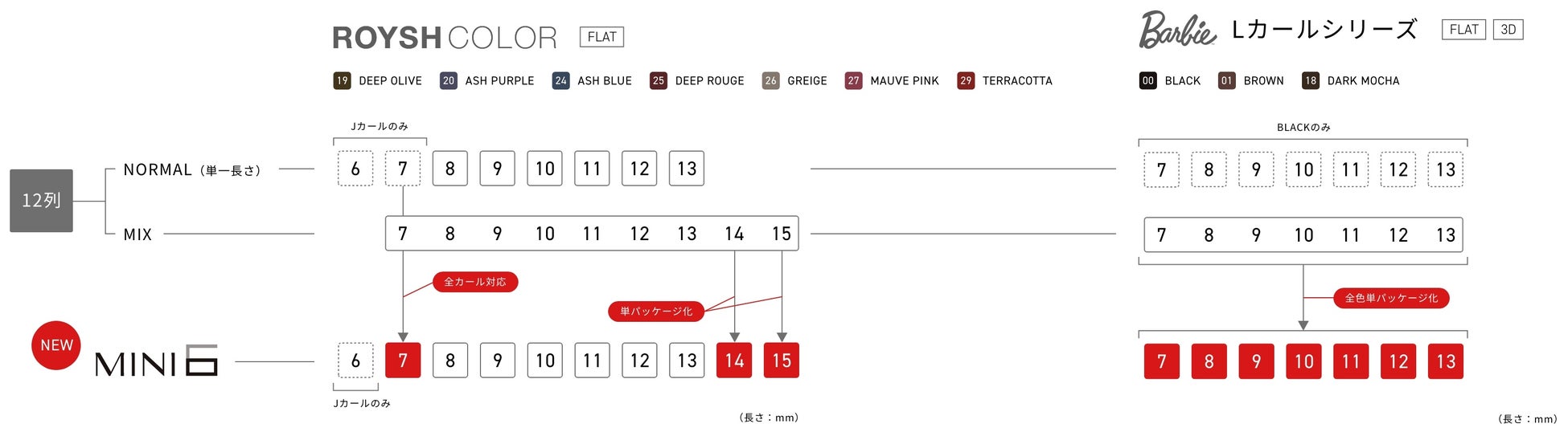「MINI6」は色も長さも冒険できるまつ毛エクステです。既存アイテムは12列で1パッケージでしたが、MINI6はハーフサイズ6列のため、使い切りやすく不良在庫リスクを軽減できます。またサイズが12列のぴったり半分のため収納もしやすいサイジング。