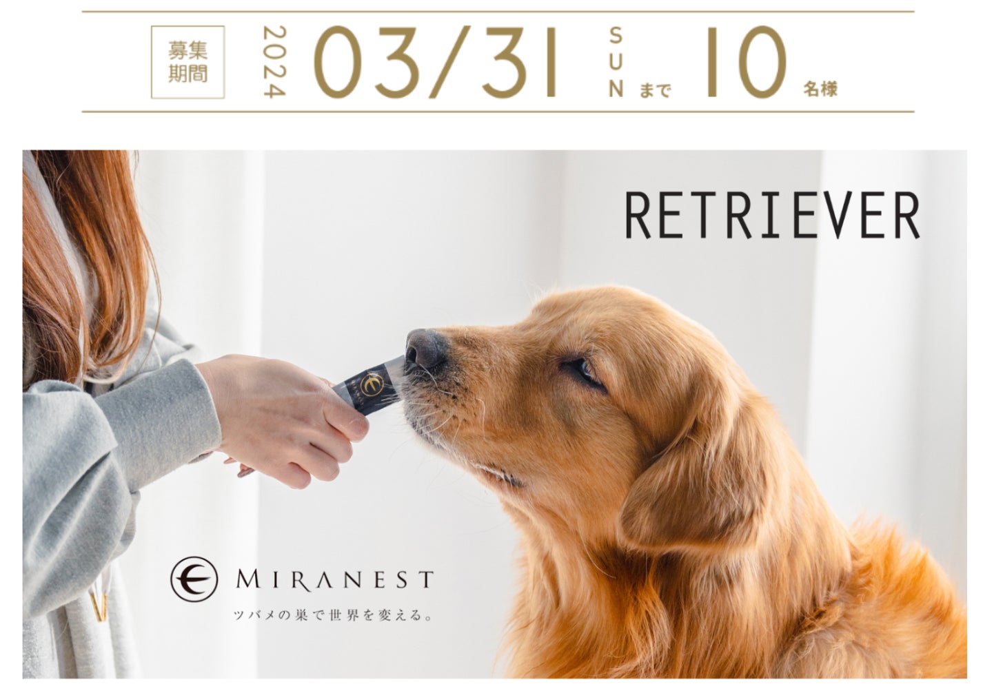 天然アナツバメの巣を使用したペットケアブランドMIRANEST<ミラネスト>(MIRANEST株式会社、福岡県福岡市、代表取締役 稲冨幹也、以下、当社)は2024年3月14日(木)からレトリーバー専門誌『 RETRIEVER』(発行:株式会社EDITORS、発売:株式会社ステレオサウンド)にて、大型犬向けモニター募集を開始しました。