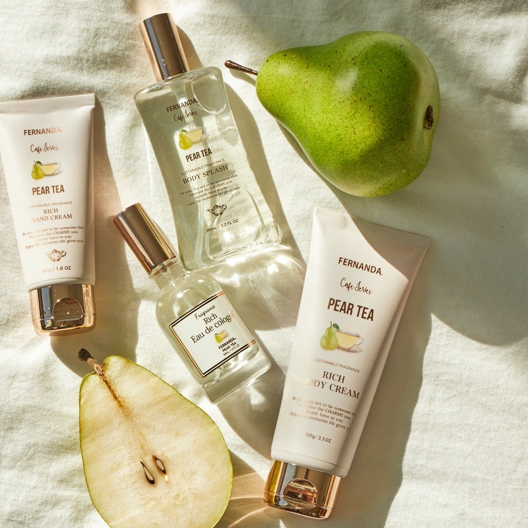 フェルナンダオリジナルの「ペアーティー」の香りは、フレッシュな洋梨の香りがベース。芳醇で奥深い甘さが贅沢に詰まっています。さらにすっきりとしたティーリーフ、華やかなジャスミンの香りが絶妙に組み合わさり、深みのあるみずみずしい香りに仕上げました。