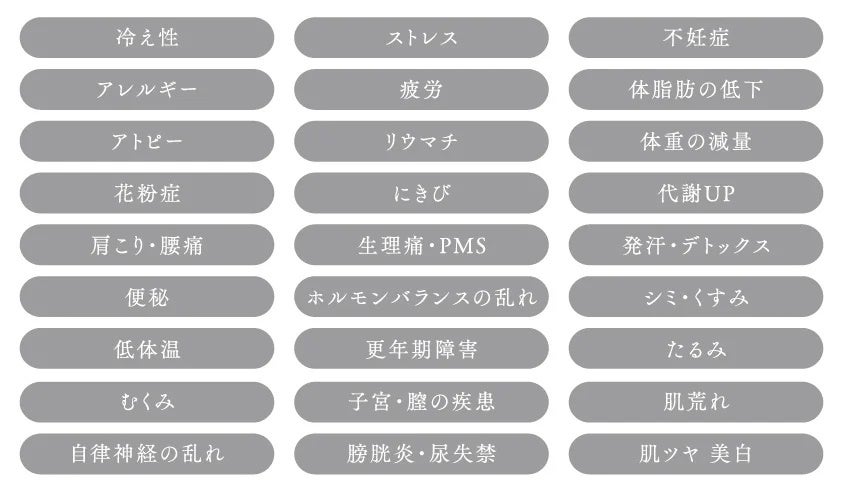 深部体温が1℃上がるだけで、代謝UP、免疫力の向上に繋がり、様々なお悩みや不調を改善できるとされています。多くの現代女性が抱えている、ダイエット、肌荒れ、シミ・シワ、生理痛、PMS、むくみなどの不調や悩みは、深部の体温を上げることで、だんだんと調子が良くなってきます。