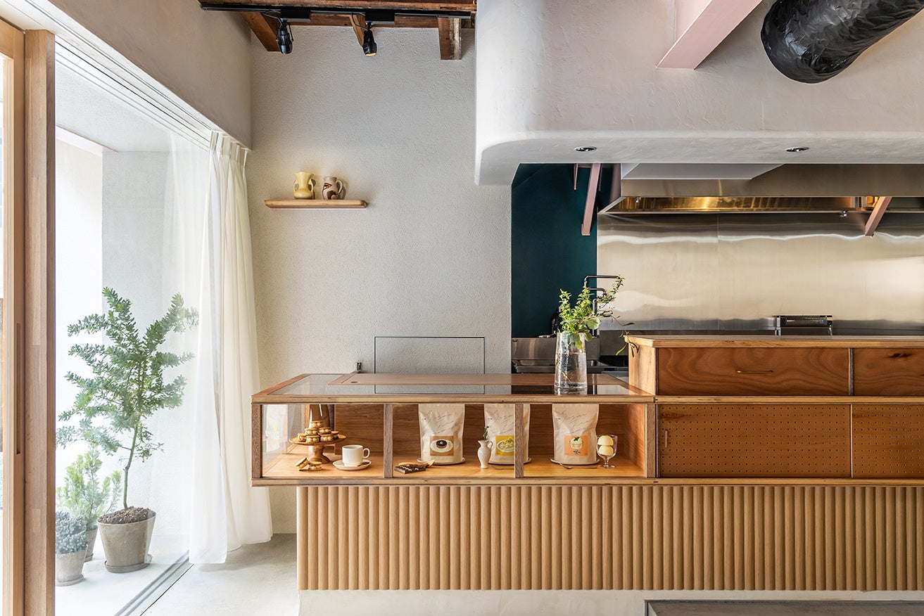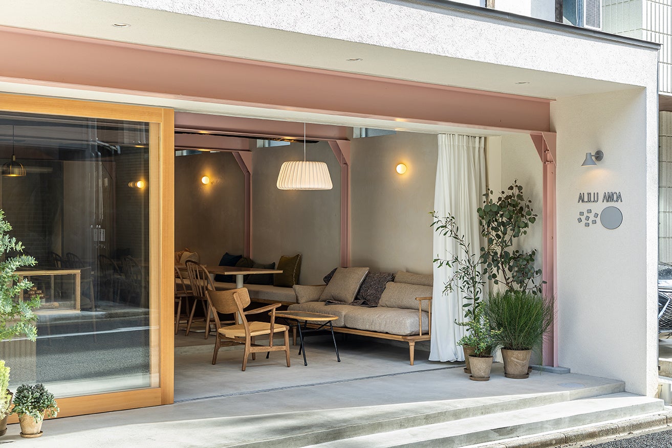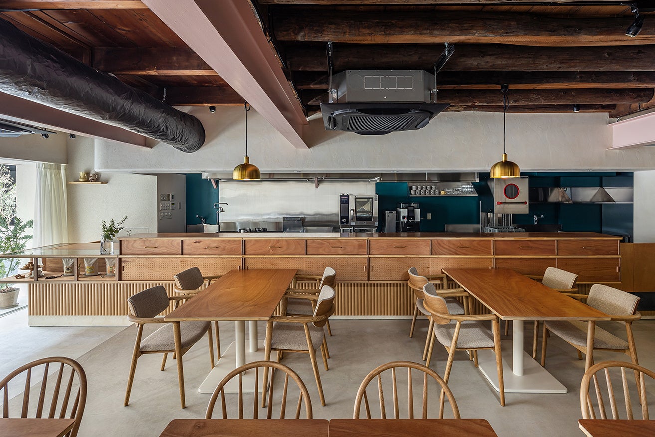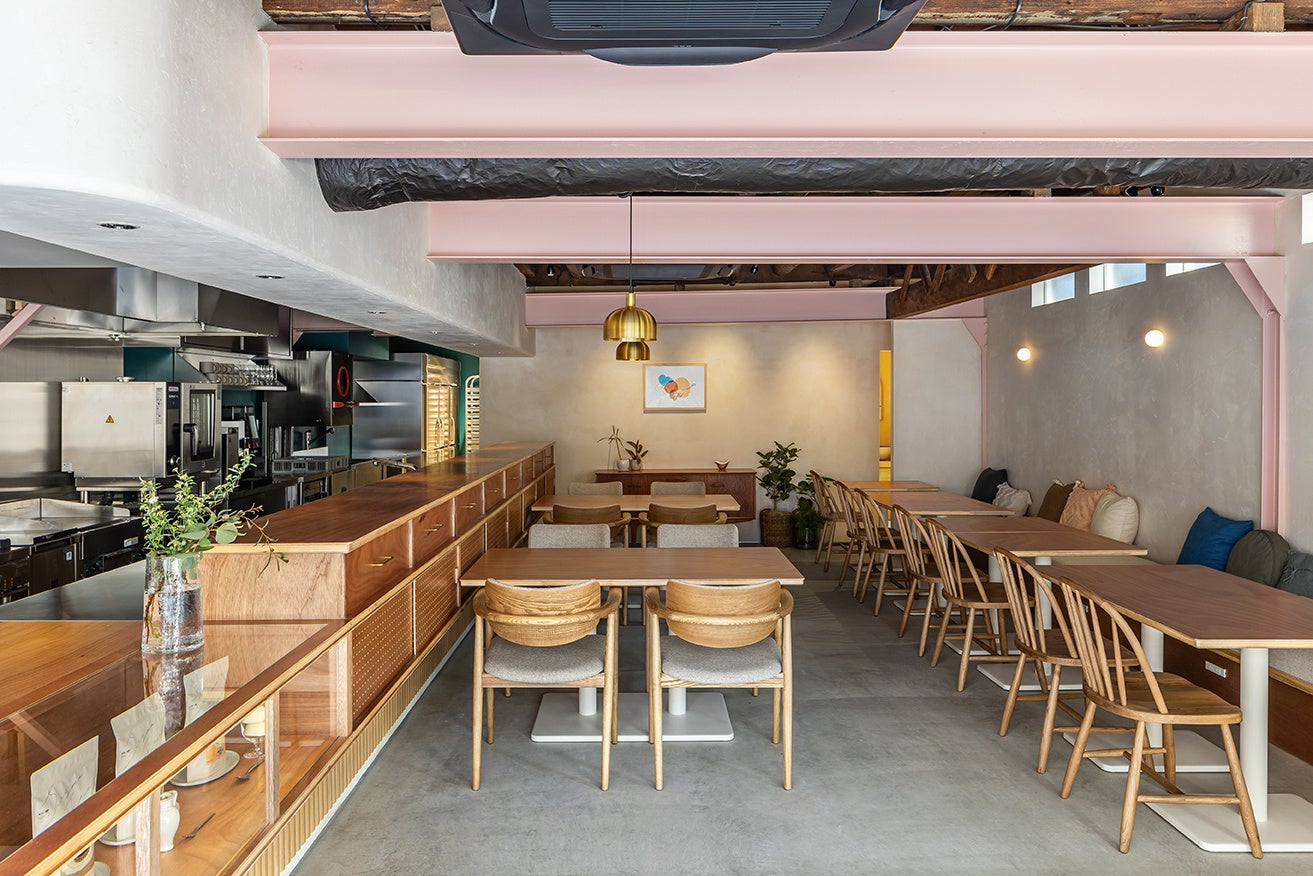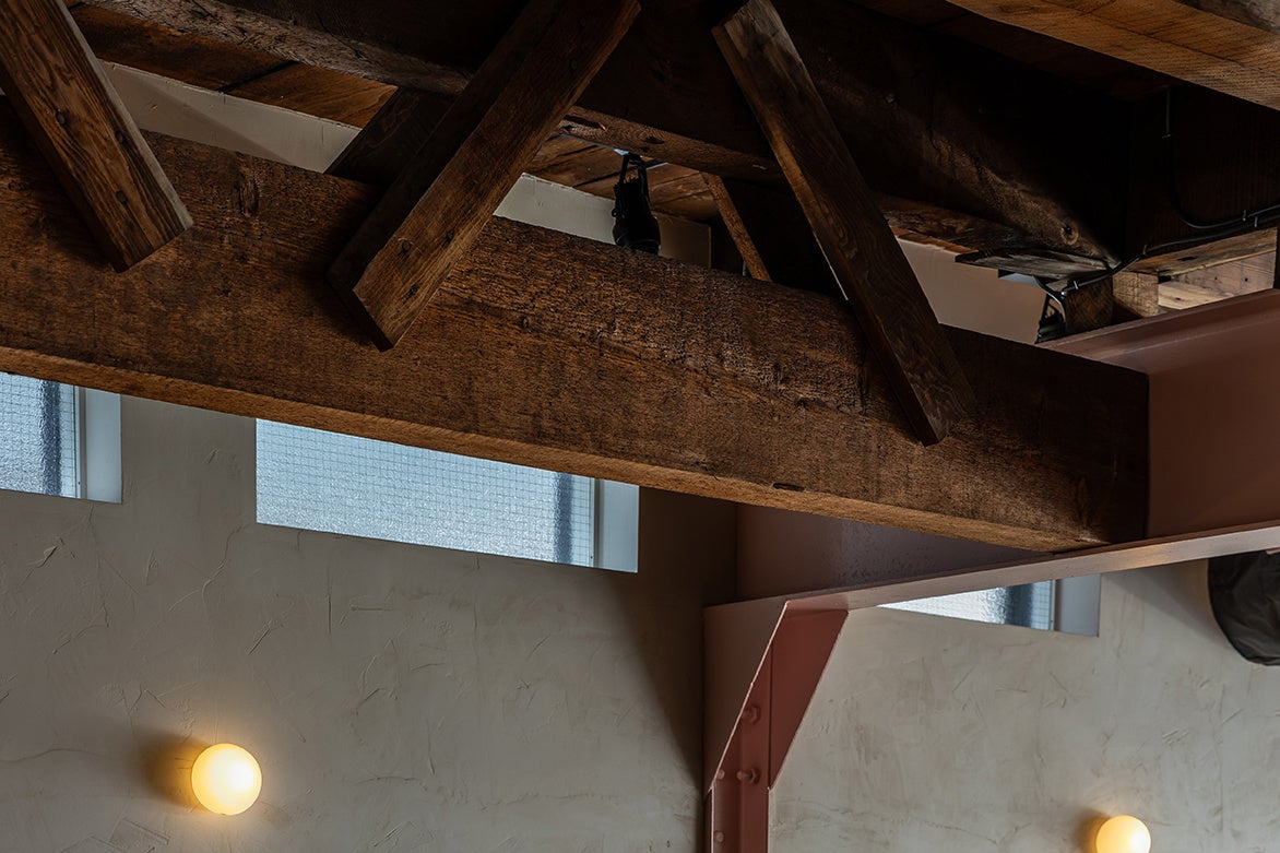 建物は新築せず前の建物を生かす形で改装。築年の古い木造建築を支えるために後から増築された鉄骨の梁でできた内観は、木造のあたたかさと、鉄骨の力強さを感じさせるハイブリットな構造であり、美味しそうな低糖質という、アリルアモアのスタイルとマッチすると捉え生かすことにした。木の天井と、鉄骨の梁は見える形でそのまま残っている。