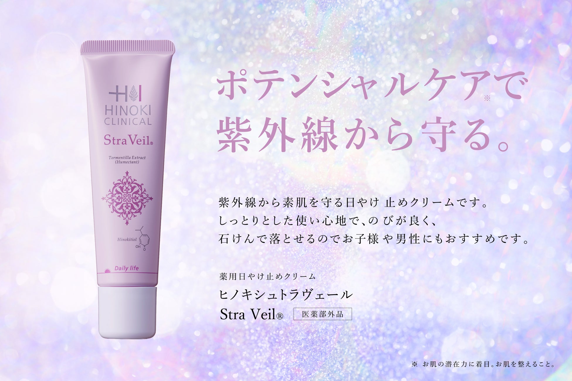 有効成分ヒノキチオール、グリチルリチン酸2Kの配合により、日やけによる肌あれを防ぎます。マロニエエキス(保湿)を配合。