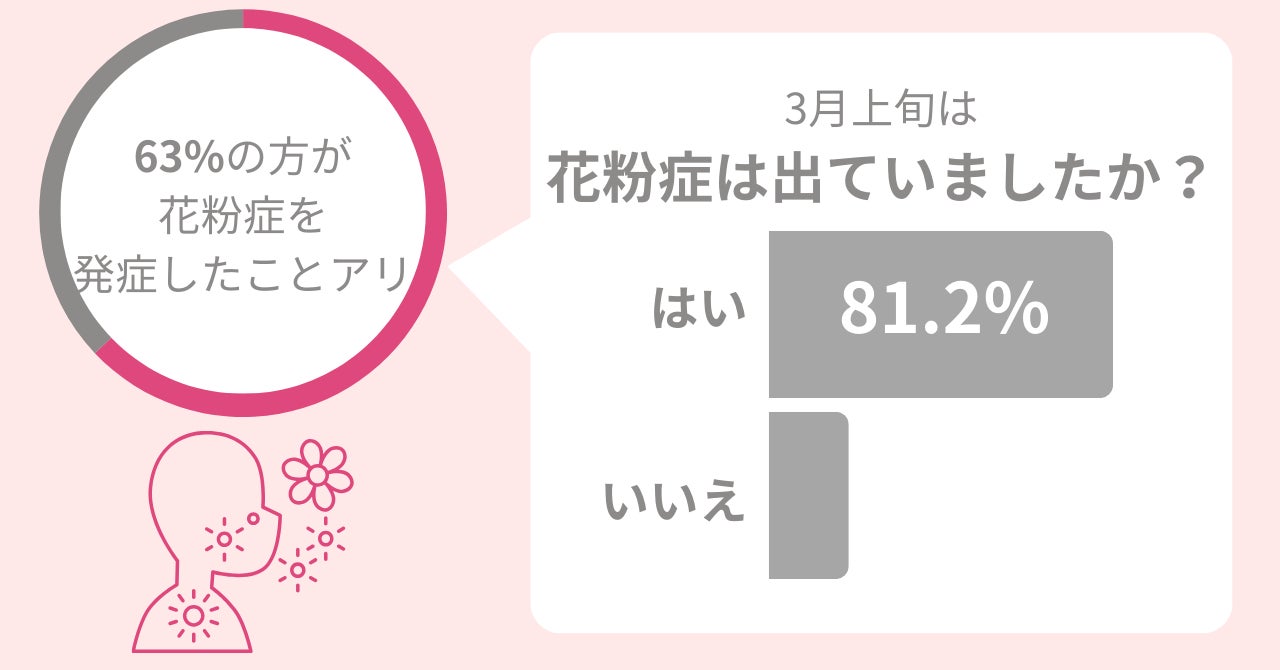 花粉症を発症したことがある人のうち、合計81.2%が今年3月上旬の時点で花粉症の症状が出ていることがわかりました。