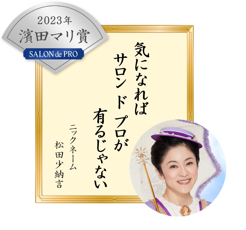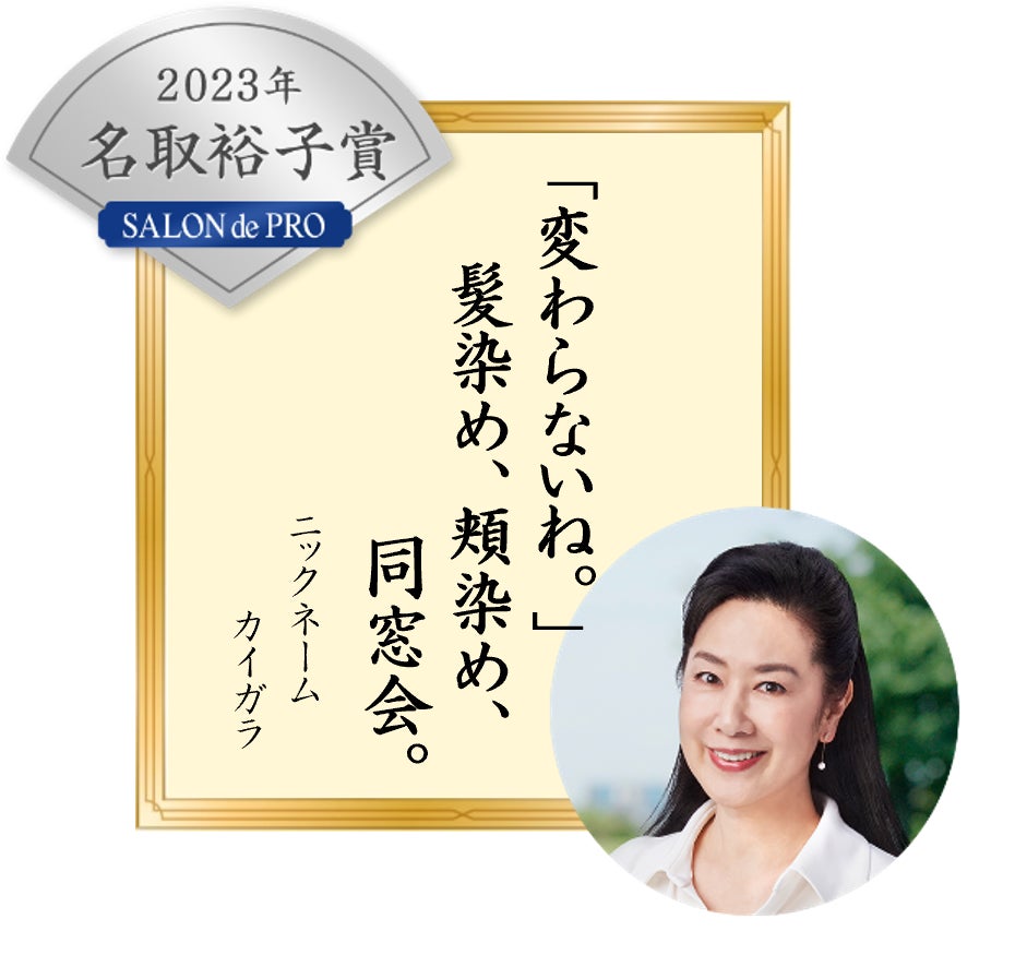 「サロン ド プロ 白髪川柳」はニオイのない白髪染め「サロン ド プロ」が2012年秋から実施している川柳コンテスト。毎月1回その月の優秀作品5句を選定し、サロン ド プロ ブランドサイトで発表しています。そしてこのたび、2023年1月~12月の優秀作品としてノミネートされた60句の中から、2023年の年間グランプリを一句選定いたしました。さらに今年度はサロン ド プロのCMに出演しているタレント2名の選出による、「名取裕子賞」「濱田マリ賞」、さらには「審査委員長賞」も同時に設け、合計4句が選ばれました。