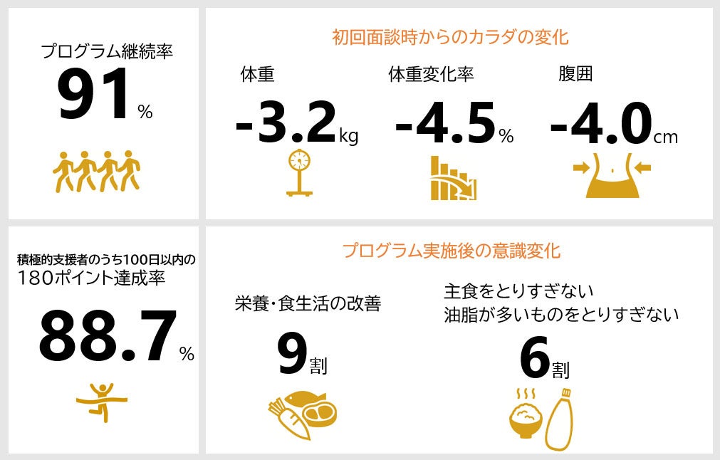 参加者全体のプログラム継続率は91%、また積極的支援対象者のうち100日以内の180ポイント達成率は88.7%。