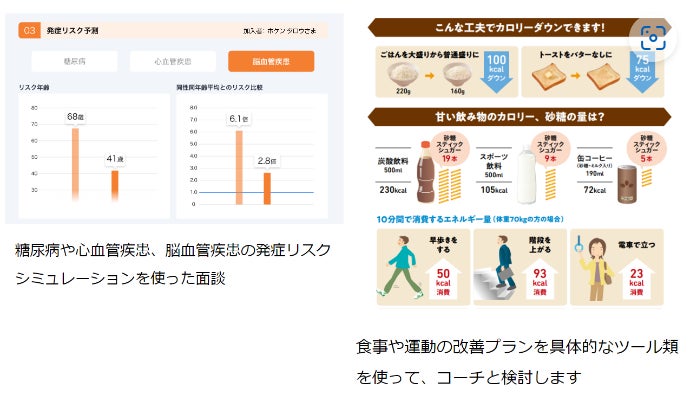 保健師、管理栄養士などの専属コーチが、初回面接から100日間、対象者をサポート。面接では、健診結果から、個別の疾病発症リスクをシミュレーション、面談をナビゲートする仕組みにより、再現性ある面談を実施。また、事前のライフスタイルチェックに基づいた改善プランを具体的に示すなど、健康課題の見える化にこだわったカウンセリングを実施します。40歳未満の対象者にも対応しています。