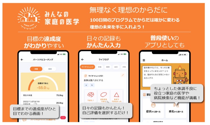 当社は、ヘルスケアアプリ「みんなの家庭の医学」を活用した新しいスタイルの特定保健指導「パーソナルコーチングforダイエット」を提供しています。アプリを使用することにより、対象者が参加・継続しやすく良い成果につながりやすいことが大きな特徴です。