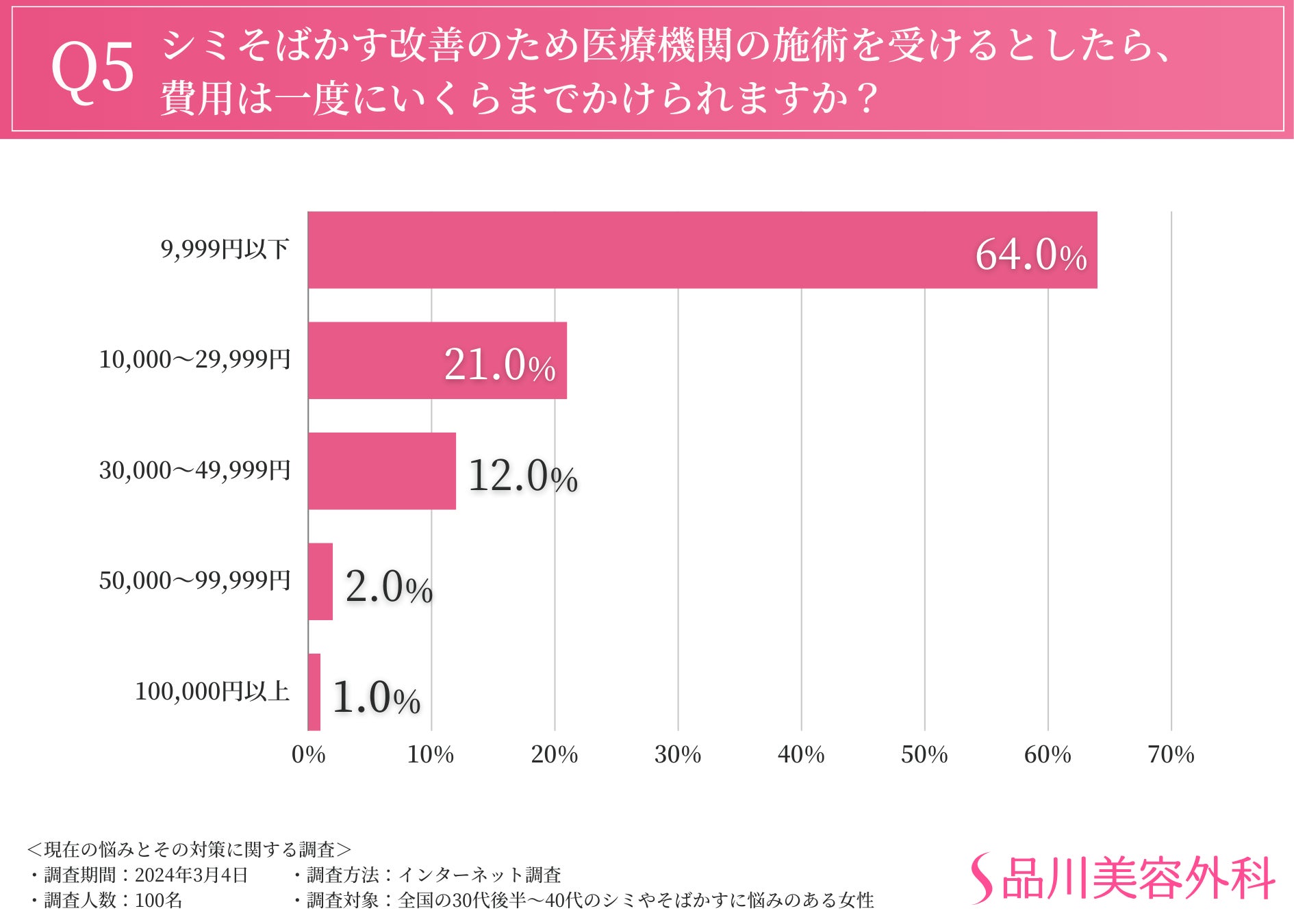そこで、シミ・そばかす改善のために医療機関の施術を受けるとしたら、費用は一度にいくらまでかけられるか伺ったところ、トップ3は「9,999円以下(64.0%)」「10,000〜29,999円(21.0%)」「30,000〜49,999円(12.0%)」という結果となりました。