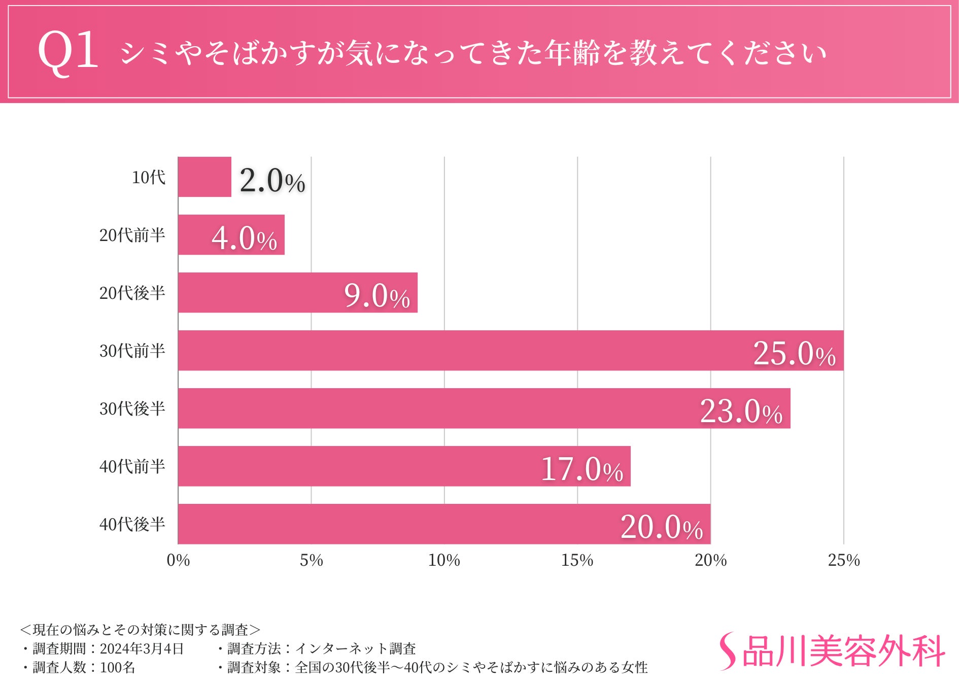 はじめに、シミやそばかすが気になってきた年齢を伺ったところ、「30代前半(25.0%)」「30代後半(23.0%)」「40代後半(20.0%)」という回答が集まりました。