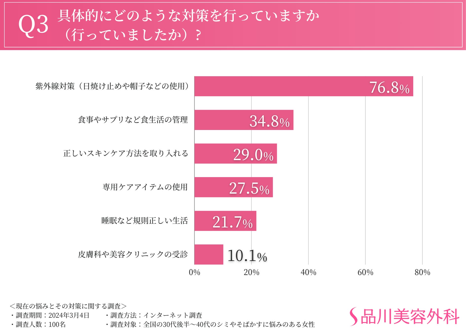 対策の内容としては、紫外線対策や食事管理など、ご自身でできる対策が多かったことから、医療機関でプロのアドバイスを聞くことで対策方法も変わってくるかもしれません。