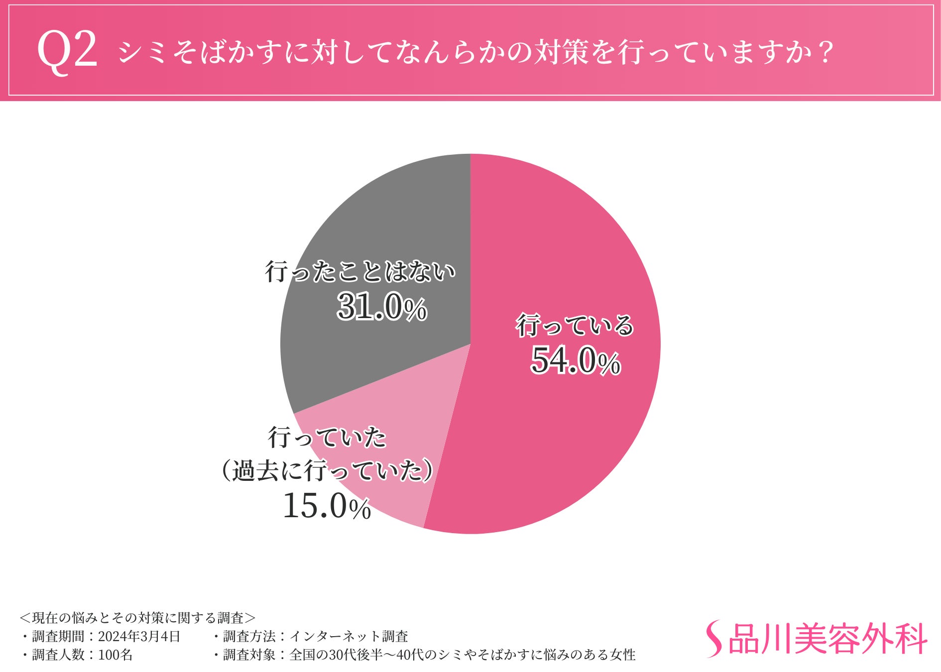 次に、シミ・そばかすに対してなんらかの対策を行っているのか伺ったところ、「行っている(54.0%)」「行ったことはない(31.0%)」「行っていた(過去に行っていた)(15.0%)」という回答が集まりました。