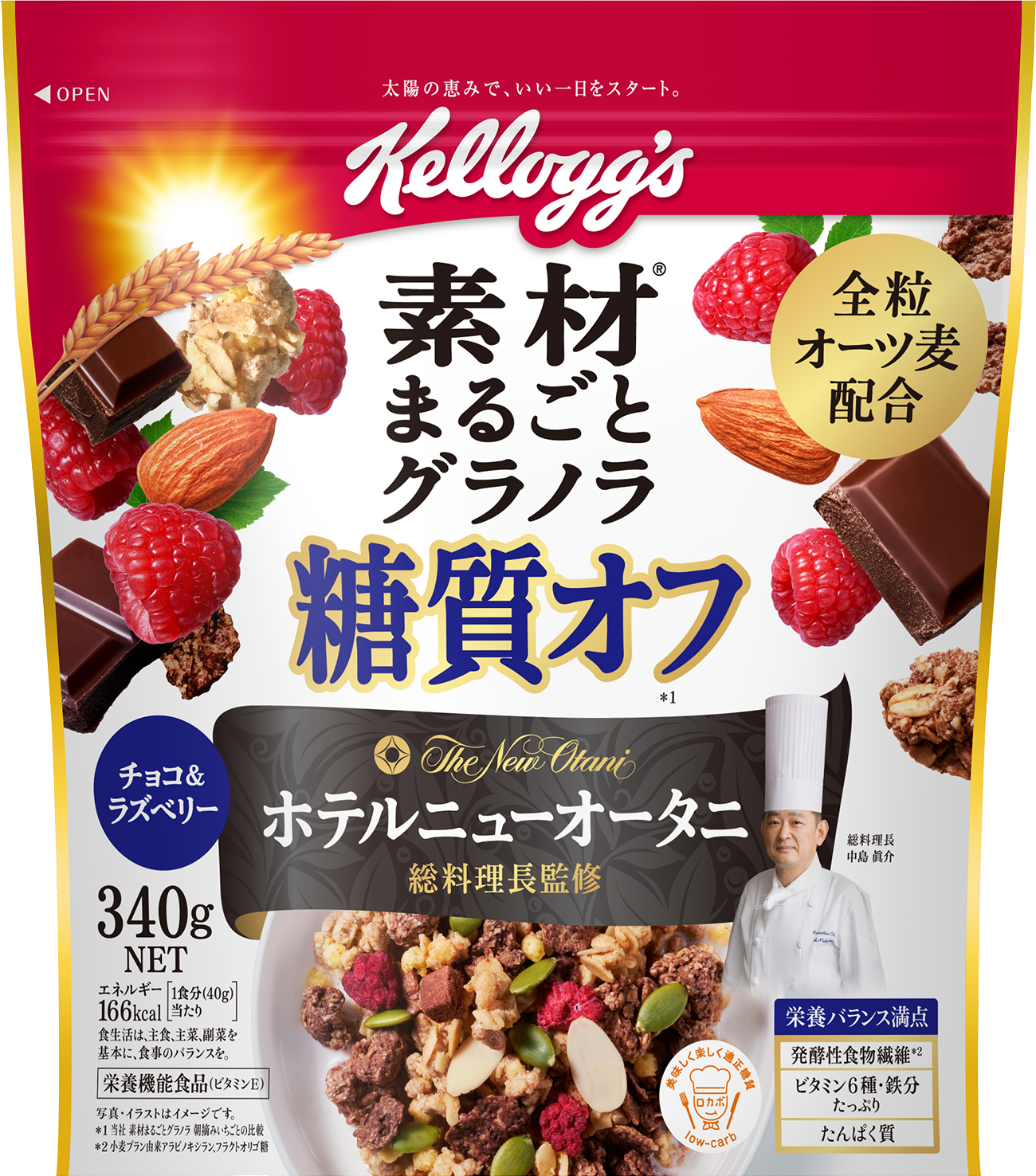 「素材まるごとグラノラ 脂質70%オフ」の新発売に伴って、既存製品である「素材まるごとグラノラ 糖質オフ」のパッケージデザインをリニューアルします。「素材まるごとグラノラ 糖質オフ」も、新製品同様、ホテルニューオータニ中島総料理長が監修した製品であり、糖質オフ*¹でありながら、香ばしく焼き上げたグラノラに3種の異なるチョコレートとさわやかな酸味のラズベリーを加えた味わいが人気の製品です。