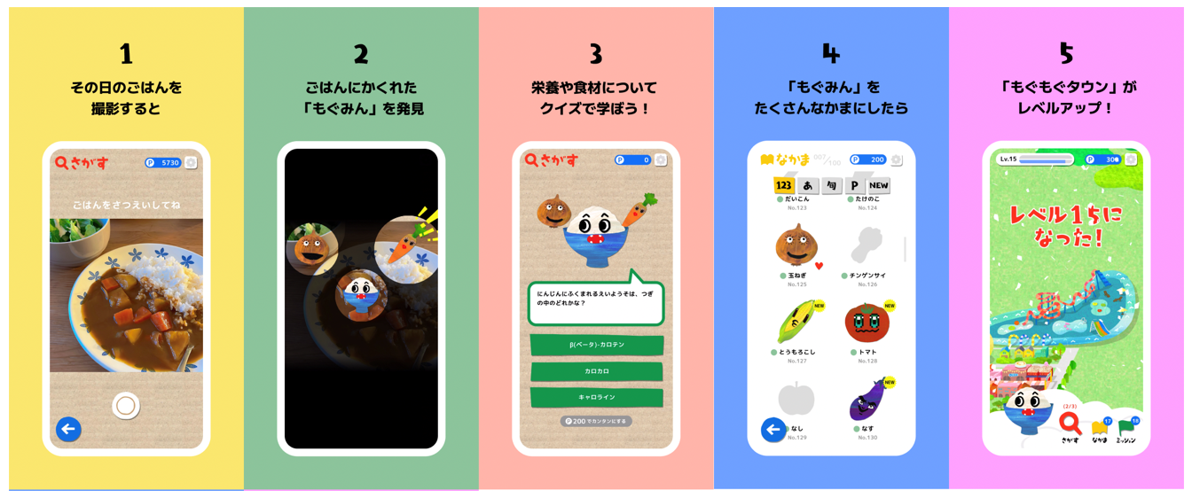 本アプリでは、食事をスマートフォンなどのカメラで撮影すると、食事に使用されている食材を認識し、その食材のキャラクター“もぐみん”がAR*1で出現。出題されるクイズに答え、 “もぐみん”を仲間にすることで「もぐもぐタウン」を発展させながら、食事や栄養バランスの大切さに加え、食材ごとの栄養のポイントや豆知識などを楽しく学ぶことができます。
