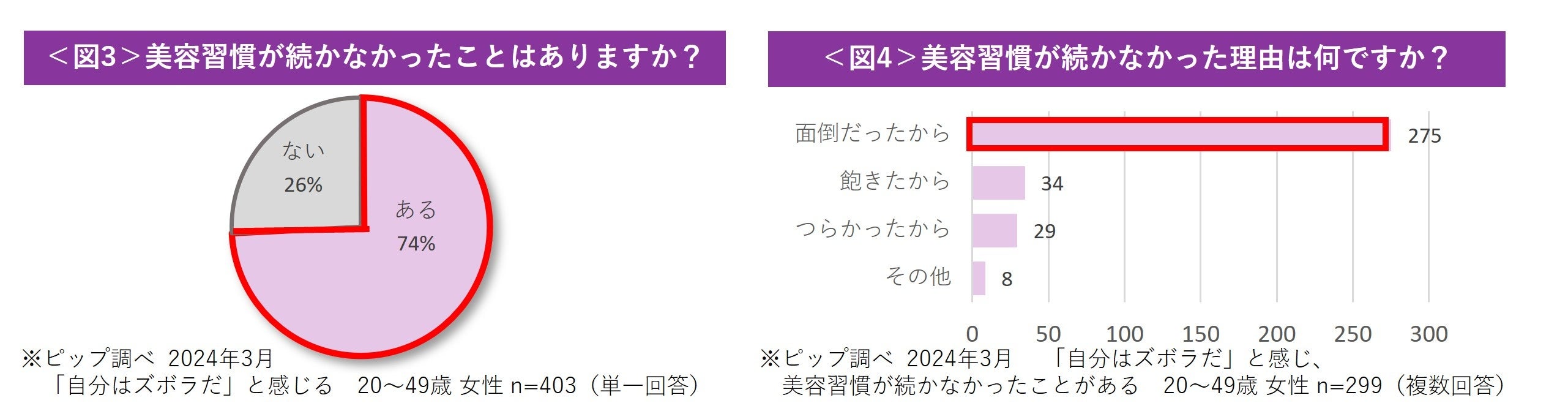 さらに、「美容習慣が続かなかったことはありますか?」という問いに対して、ズボラを自覚している女性のうち74%が「ある」と回答しています<図3>。美容習慣が続かなかった理由としては、9割以上が「面倒だったから」と回答しており、最も多い結果です<図4>。「面倒さ」を感じることが、女性の美容習慣の継続を困難にしている大きな原因の一つであることが伺えます。