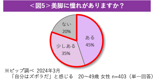 「自分はズボラだ」と自覚している女性の美への意欲を調査すべく、「美脚への憧れがあるか」を調査しました。すると、ズボラを自覚している女性のうち80%が、美脚への憧れが「ある」と回答しています<図5>。この結果から、ズボラだからといって美への意欲が低いということはなく、「ズボラなのに美意識が高い」、あるいは「美意識は高いのにズボラである」女性が多くいることが伺えます。