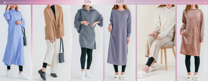 お出かけの時の服装にも、就寝時のパジャマにも使える「着圧リブレギンス」なら、