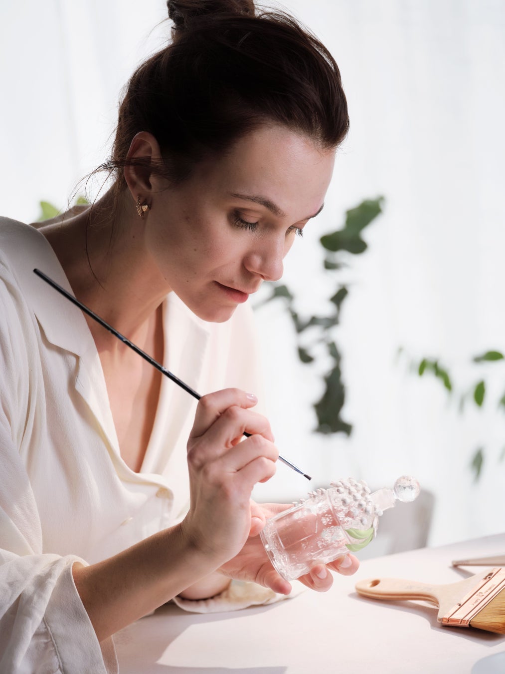 “白の彫刻家”の異名を持つアン・ロペスは、素材を操る芸術家。彼女は、ゲランのアイコンであるビーボトルを、大理石パウダーを混ぜた漆喰で作られた24輪のベルシェイプのスズランで優雅に彩り、ブラシで丁寧にあしらわれた繊細な金箔のアクセントとやわらかなグリーンの葉の彫刻をビーボトルの曲線と見事に調和させました。